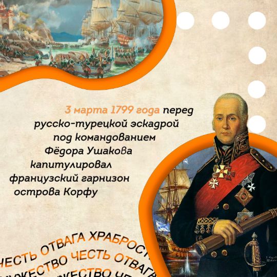 3 марта 1799 года русская эскадра под командованием адмирала Фёдора Фёдоровича Ушакова осуществила успешный штурм крепости Корфу, расположенной на одноименном острове в ионическом море. Это событие стало важной вехой в истории русской военно-морской истории и в контексте борьбы России за влияние в Средиземноморье.